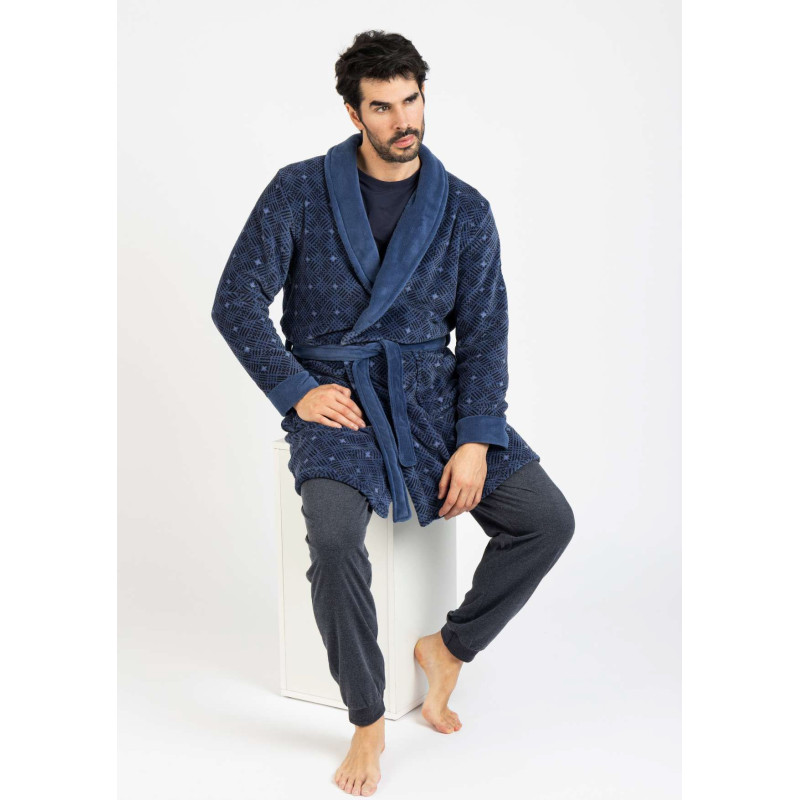 Cálida bata elaborada en suave coralina para caballero, lleva bolsillos frontales y cinturón. En color azul con ligero diseño en rayas negras. (VER FOTO)