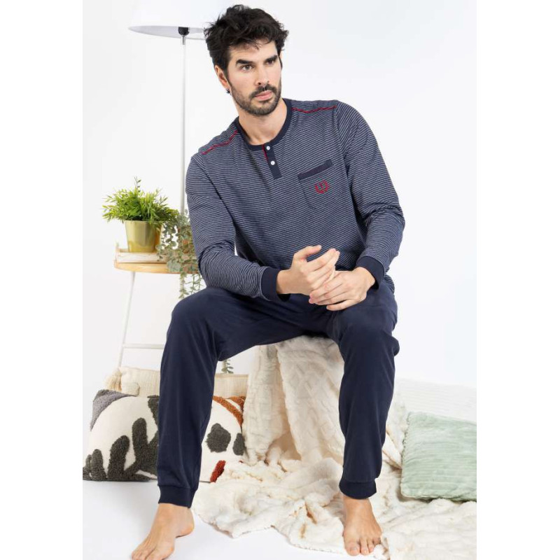 Bonito pijama elaborado en algodón para caballero, camiseta a rayas con botonera frontal para mayor comodidad y un pequeño bolsillo, y pantalón liso con puño. (VER FOTO)