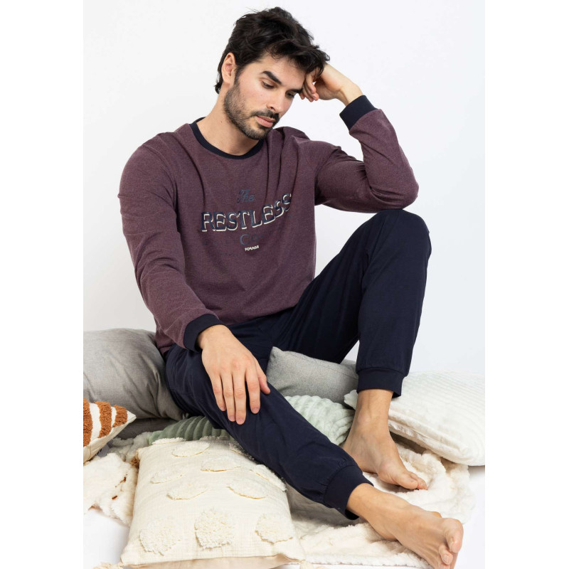 Cómodo y cálido pijama de invierno para caballero, lleva una camiseta en color burdeos con diseño frontal y cuello redondo, pantalón liso en color marino con puño. (VER FOTO)