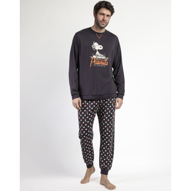 Pijama de punto de algodón manga larga, con cuello redondo y pantalón largo. Lleva una camiseta de punto interlock, color marengo, con detalles en relieve y diseño de la marca Peanuts. Pantalón de punto vigoré, con cinturilla elástica con cordón, bolsillo trasero y puños. (VER FOTO)