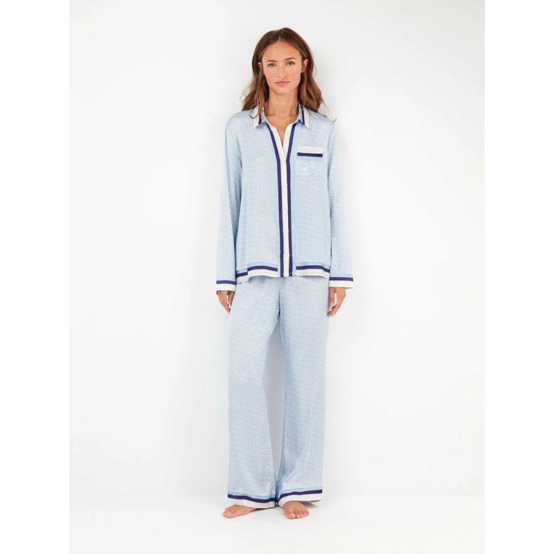 Pijama camisero con estampado monogram logo en tonos celeste y beiges y pinceladas de marino. CEsta confeccionado en satén compuesto por una camisa cuello mao botones delanteros y bolsillo con cenefas a contraste en los extremos. Pantalón recto ajustable en cintura y cenefa en el bajo a contraste.(VER FOTO)