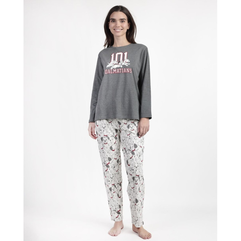 Pijama de punto de algodón manga larga, con cuello redondo y pantalón largo. Lleva una camiseta de punto interlock, color gris jaspe, con detalles en relieve y diseño de Dálmatas. Pantalón de punto interlock, con cinturilla elástica con cordón. (VER FOTO)