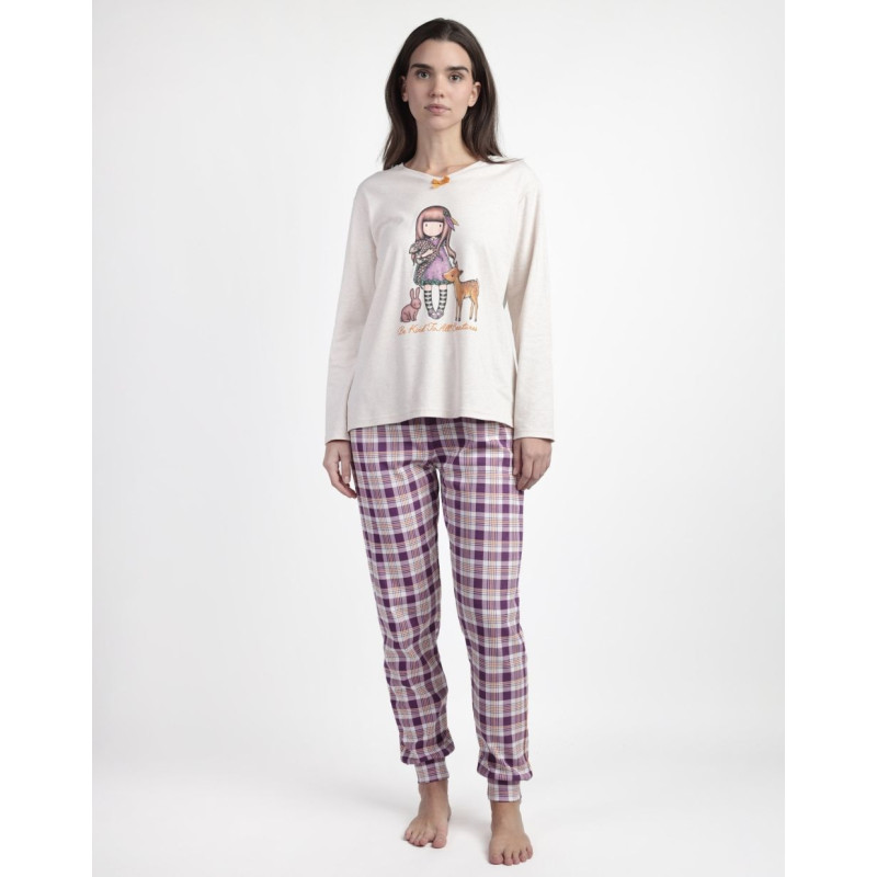 Pijama de punto de algodón manga larga, con cuello pico y pantalón largo. Lleva una camiseta de punto interlock vigoré, color beige, lleva detalles en relieve y lazo con un diseño personalizado de Santoro Gorjuss. (VER FOTO)